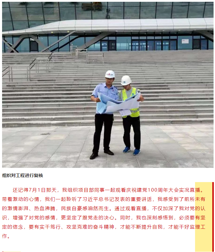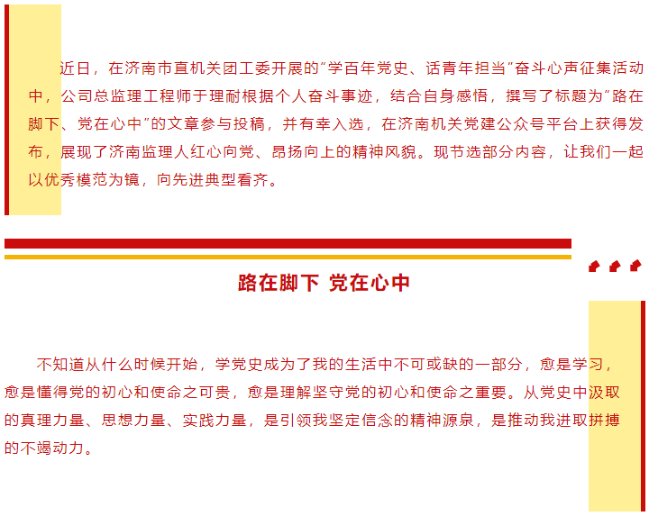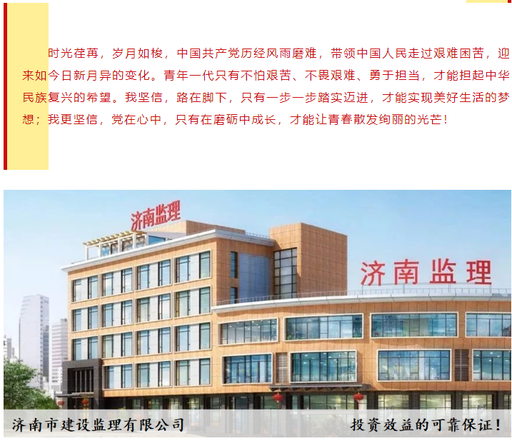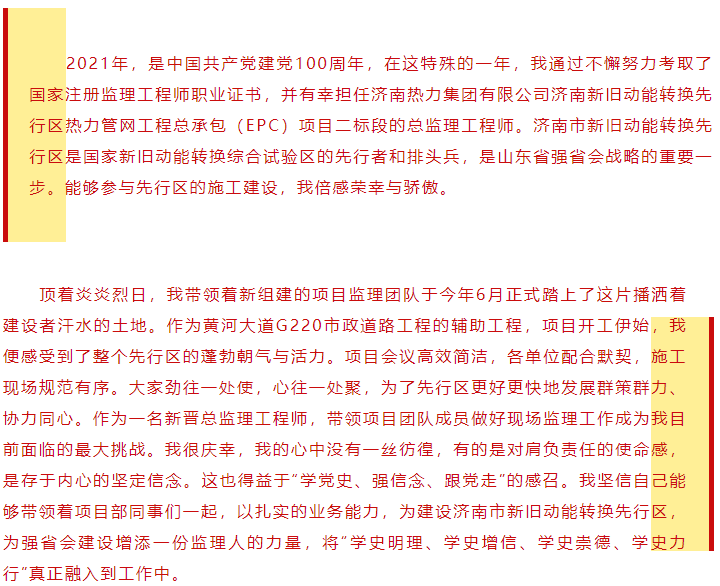 濟南監(jiān)理總監(jiān)理工程師于理耐奮斗事跡獲市直機關(guān)團工委“學(xué)百年黨史 話青年擔(dān)當(dāng)”奮斗心聲活動展播